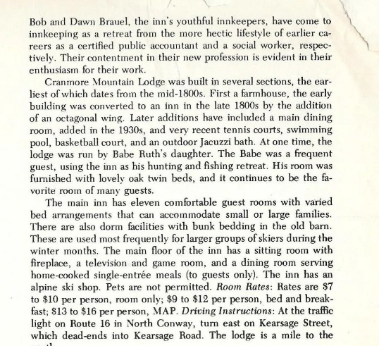 In 2016, Peter Young, the youngest son of owners Stafford and Paula Young, was able to verify many of the historical tidbits by providing his memories of his years growing up at Cranmore Mountain Lodge: